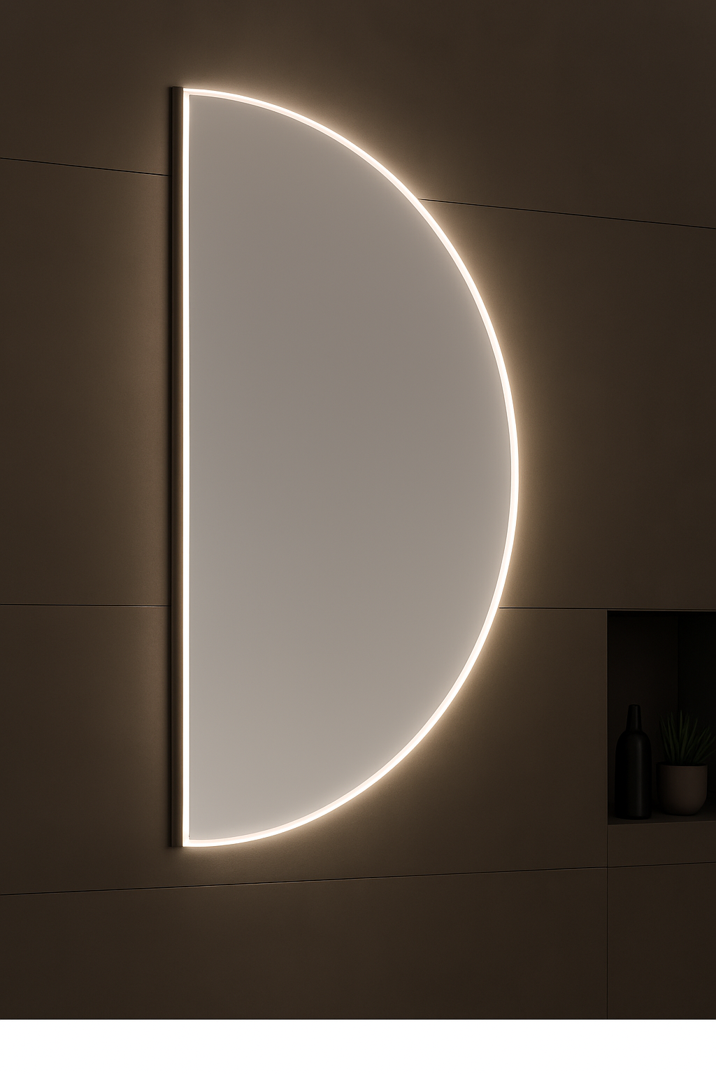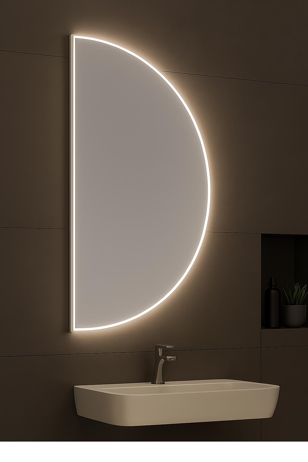 A modern half-moon shaped frameless mirror with integrated LED perimeter lighting, touch sensor controls, and optional anti-fog functionality. Its sleek design adds elegance to bathrooms, dressing rooms, or salons while providing soft, energy-efficient illumination.
